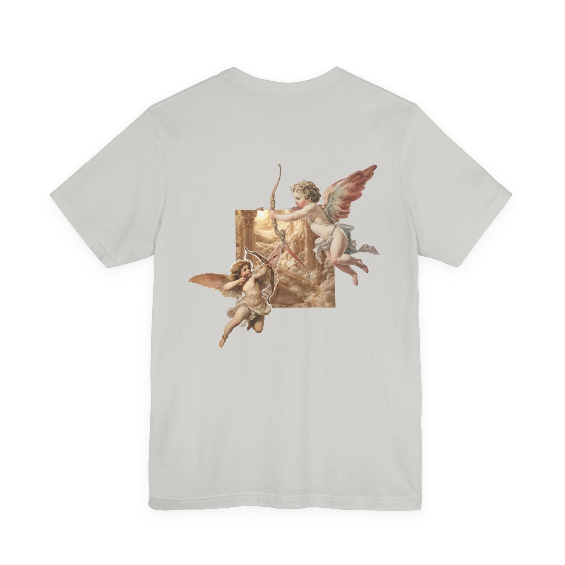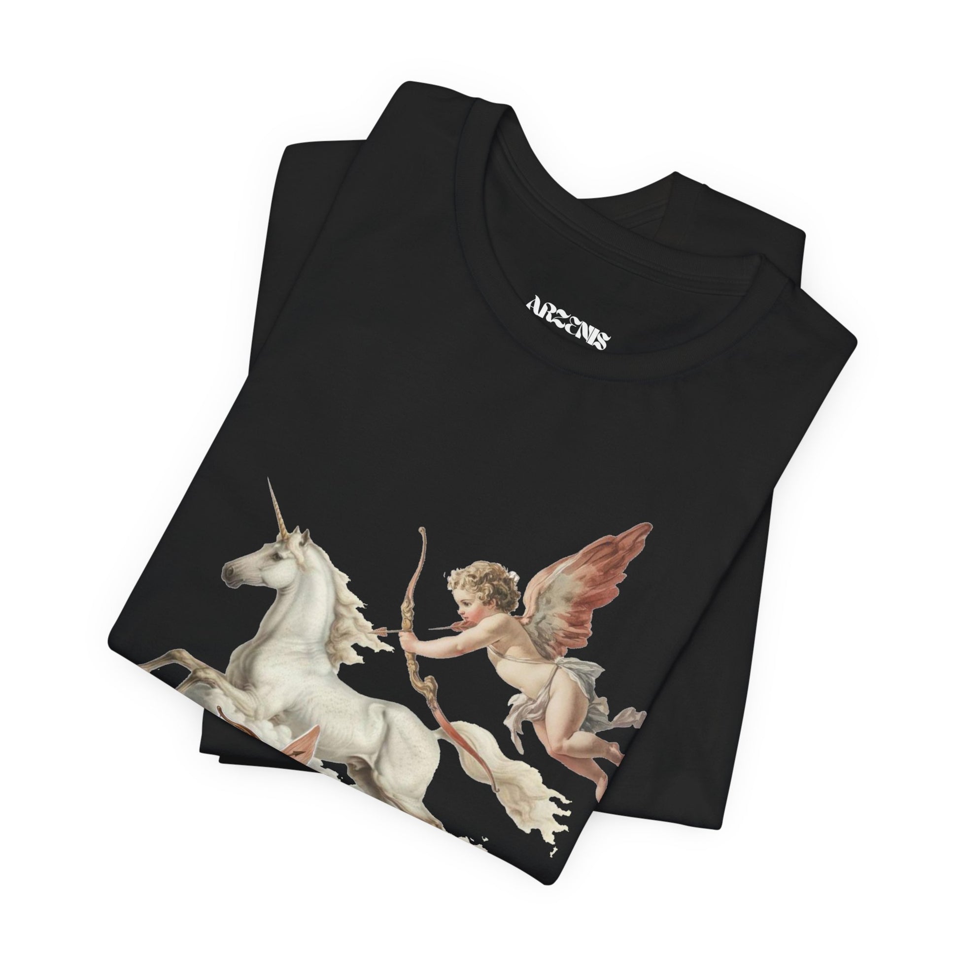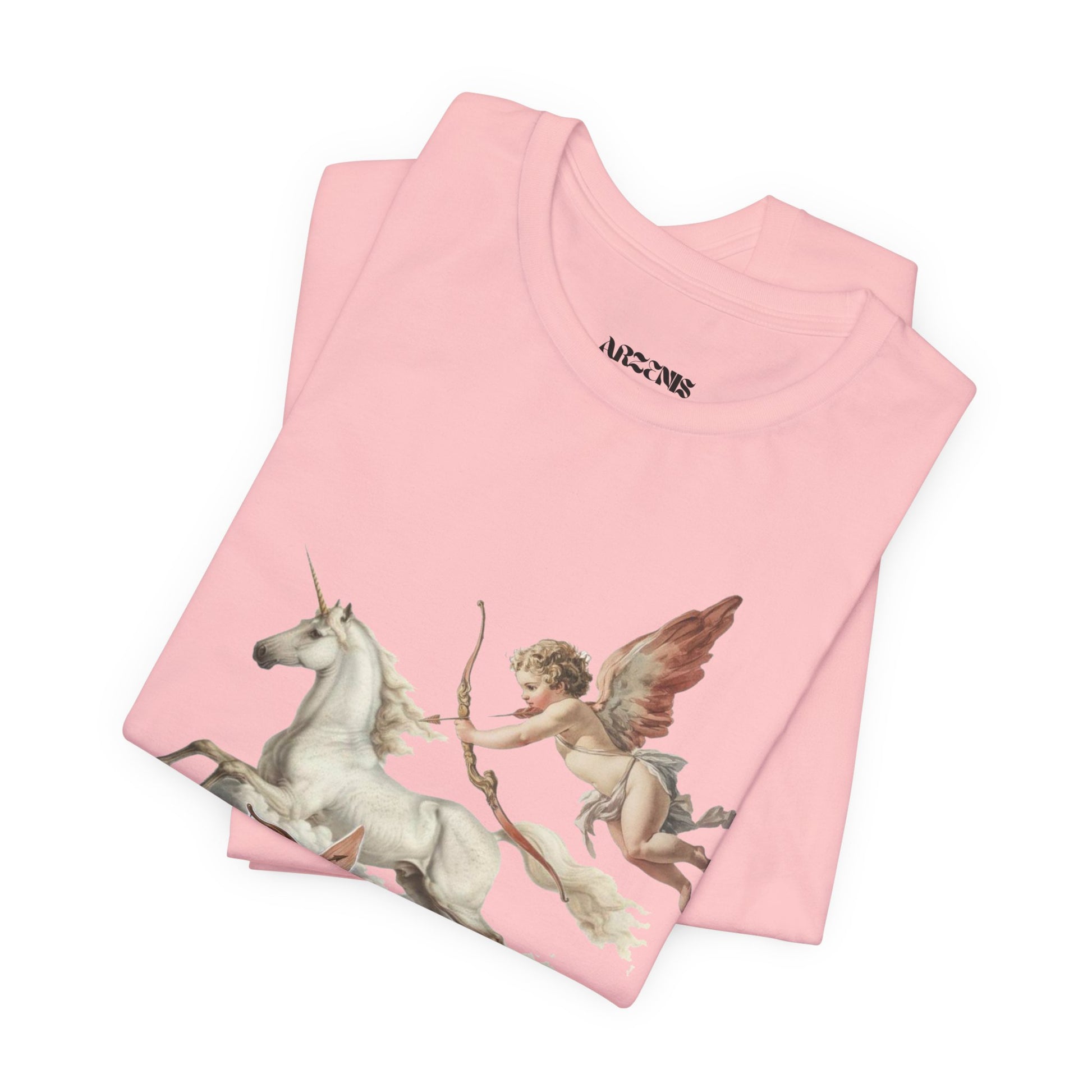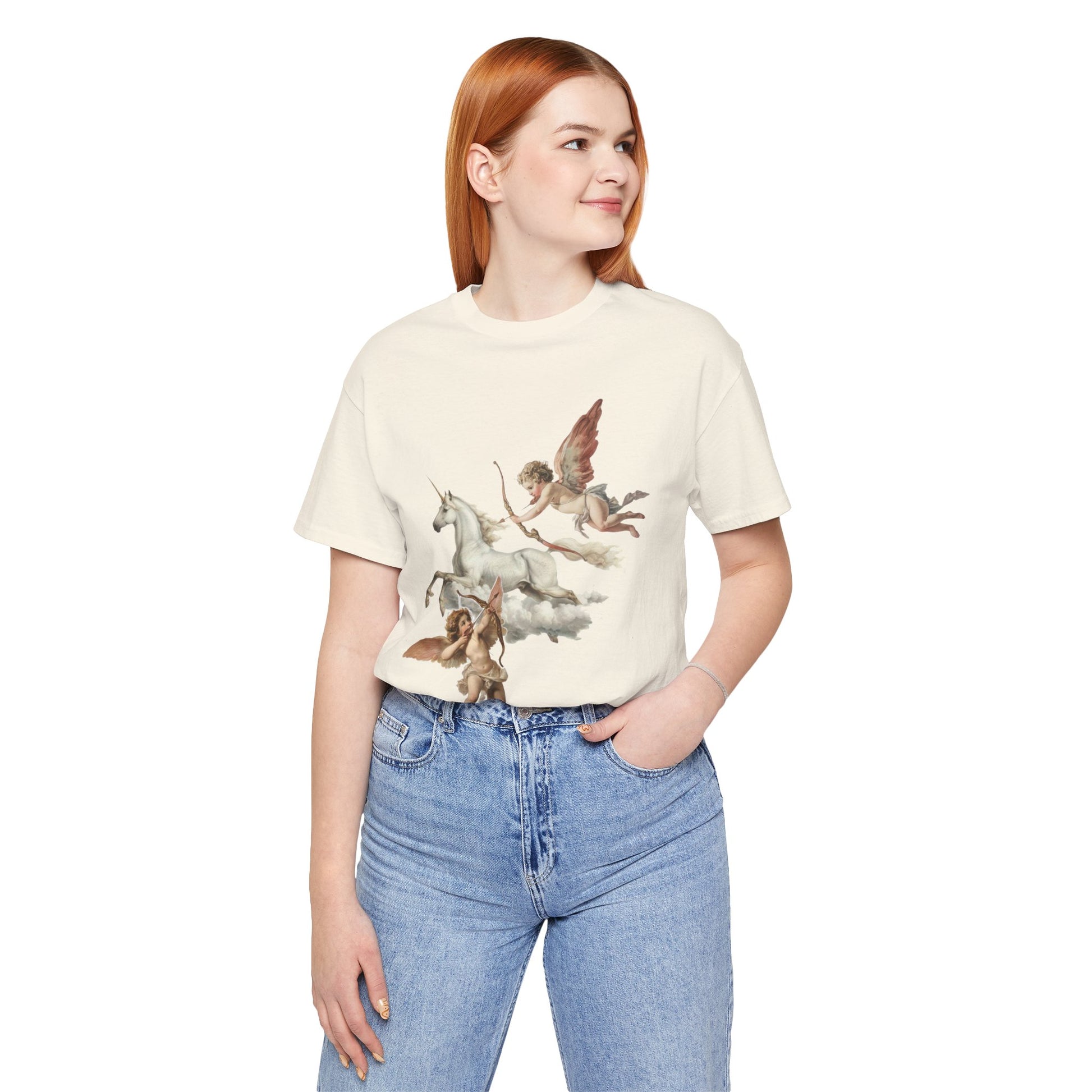 Introducing a stylish Unisex Jersey Short Sleeve Tee that effortlessly blends craftsmanship with eye-catching design. This tee features a whimsical yet enchanting illustration of cherubs and a unicorn, bringing a magical touch to your everyday wear. Perfect for casual outings, this shirt invites a sense of wonder and nostalgia, making it ideal for those who appreciate art and fantasy. The lightweight fabric ensures a comfortable fit for both leisurely days and social gatherings, making it a staple for your wardrobe. Great for gifting during holidays like Valentine's Day, birthdays, or anniversaries, this tee resonates with anyone who embraces creativity and whimsy. Whether you're dressing up for a celebration or keeping it relaxed, this tee fits seamlessly into your life and style.
